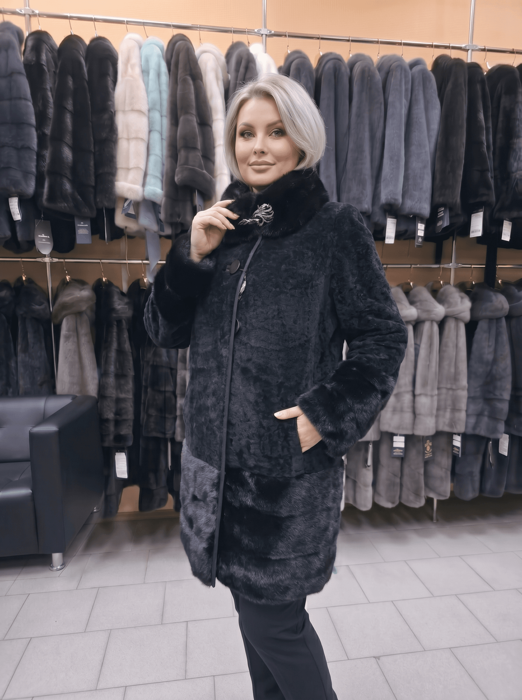 Полушубок из астрагана ОМ-Снежка-01: Роскошное сочетание с мехом норки Элегантность в каждом движении. Модель ОМ-Снежка-01 — это воплощение изысканного стиля для женщин, которые ценят эксклюзивность и комфорт. Сочетание бархатистого астрагана и сияющей норки создает глубокую игру фактур, делая классический черный цвет по-настоящему многогранным и статусным. Особенности дизайна ОМ-Снежка-01: Премиальный Астраган: Основа полушубка выполнена из астрагана высшего качества. Этот мех славится своей невероятной легкостью, износостойкостью и уникальным муаровым узором, который не создает лишнего объема. Комбинированный низ: Нижняя часть изделия эффектно дополнена вставками из натуральной норки. Горизонтальные линии норкового меха придают модели современный динамичный вид и дополнительную плотность там, где это необходимо. Воротник «Опаш»: Роскошный высокий воротник из густой норки мягко обрамляет лицо. Он не только защищает от самого сильного ветра, но и служит главным украшением модели. Ювелирный акцент: Изящная брошь-застежка на воротнике добавляет образу блеска и женственности, фиксируя воротник в нужном положении. Стильная отделка: Вертикальная кожаная планка вдоль застежки визуально вытягивает силуэт, подчеркивая стройность фигуры. Характеристики: Артикул: ОМ-Снежка-01 Материал: Натуральный астраган, отделка — натуральная норка. Цвет: Насыщенный черный (Black). Размерный ряд: Богатая палитра размеров от 40 до 60. Мы обеспечим идеальную посадку на любую фигуру. Функциональность: Удобные прорезные карманы и надежная скрытая застежка. Ваш комфорт при покупке: 🚛 Доставка по всей РФ: Оперативно отправим ваш заказ в любой регион России. 💎 Оплата после примерки: Никаких предоплат и рисков. Вы оплачиваете покупку только после того, как убедитесь в безупречном качестве и правильном выборе размера перед зеркалом. 📸 Гарантия реальности: На фото представлено реальное изделие из нашего торгового зала. Хотите примерить модель ОМ-Снежка-01? Оставьте заявку прямо сейчас