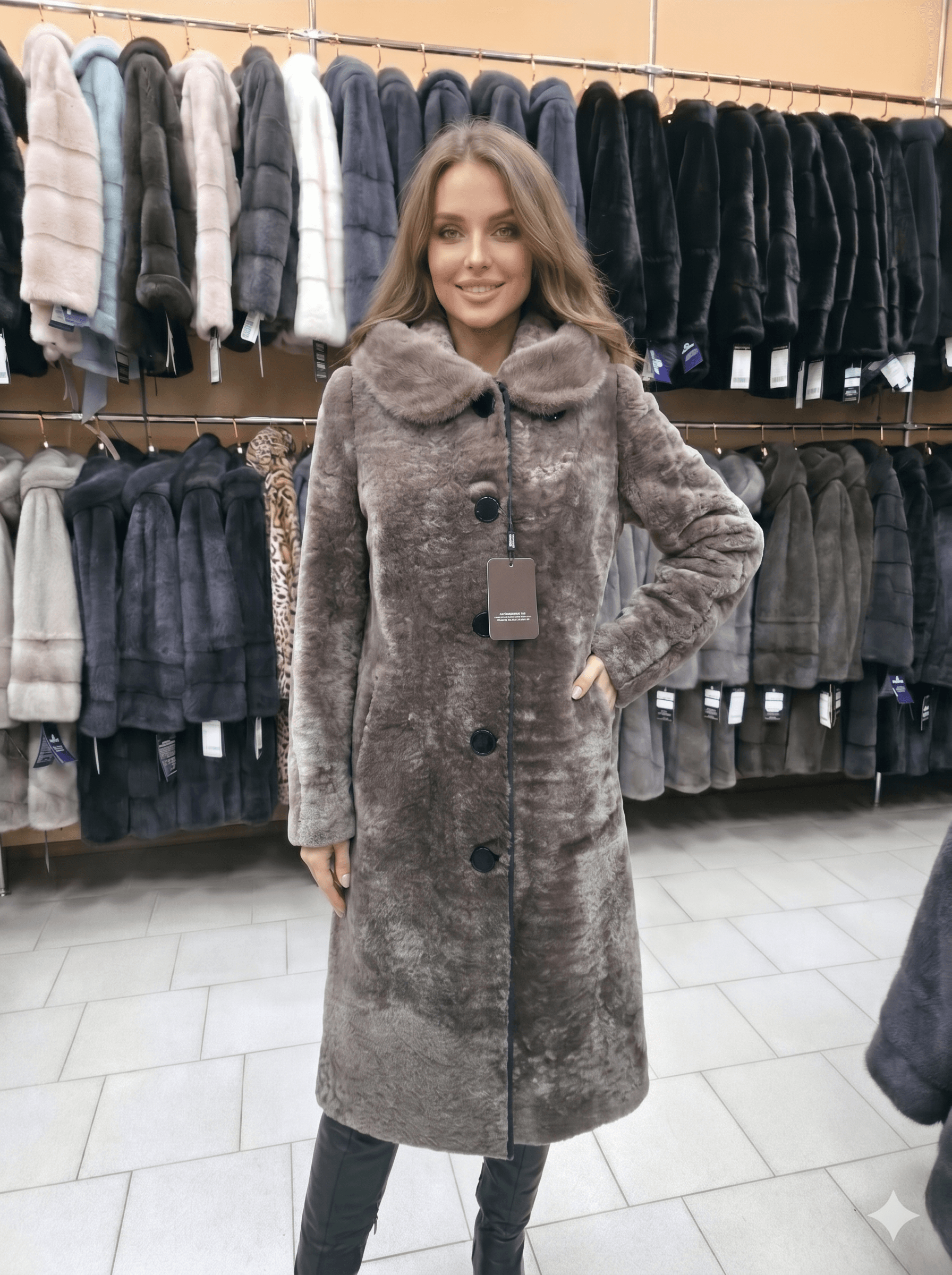 Шуба из астрагана ОМ-Снежка-04: Уют и роскошь в цвете «Шоколад» Ваш идеальный спутник для морозной зимы. Модель ОМ-Снежка-04 — это сочетание благородного коричневого оттенка и премиального качества материалов. Эта шуба создана для тех, кто ценит классику, но хочет выглядеть современно и стильно даже в самые холодные дни. Особенности модели ОМ-Снежка-04: Премиальный Астраган: Мех с уникальной завитковой фактурой, который отличается особой легкостью. Астраган невероятно износостоек, не скатывается и сохраняет свой первозданный вид долгие годы. Капюшон с отделкой из норки: Глубокий, теплый капюшон оторочен натуральной норкой. Это не только добавляет изделию статусности, но и обеспечивает исключительный комфорт: мех норки очень нежный на ощупь и отлично защищает лицо от ветра. Элегантная длина (110 см): Длина «миди» — это самый практичный вариант. Она надежно закрывает колени, сохраняя тепло, и идеально сочетается как с платьями, так и с классическими сапогами или ботфортами (как на фото). Акцентные детали: Крупные стильные пуговицы и вертикальная отделка вдоль застежки визуально вытягивают силуэт, придавая фигуре стройность. Характеристики: Артикул: ОМ-Снежка-04 Материал: Натуральный астраган, отделка капюшона — натуральная норка. Цвет: Насыщенный коричневый (Chocolate / Brown). Размерный ряд: Широчайшая палитра размеров от 40 до 60. Мы поможем подобрать идеальный размер для безупречной посадки! Сервис и гарантии для вас: 🚛 Доставка по всей РФ: Мы оперативно отправим вашу покупку в любой регион России. 💎 Оплата после примерки: Мы уверены в качестве своего меха. Сначала вы примеряете шубу, оцениваете её в зеркале, и только потом принимаете решение об оплате. 📸 Честные фото: На сайте представлены реальные фотографии изделий из нашего торгового зала. Хотите встретить эту зиму в тепле и нежности? Забронируйте ваш размер модели ОМ-Снежка-04 прямо сейчас! Напишите нам
