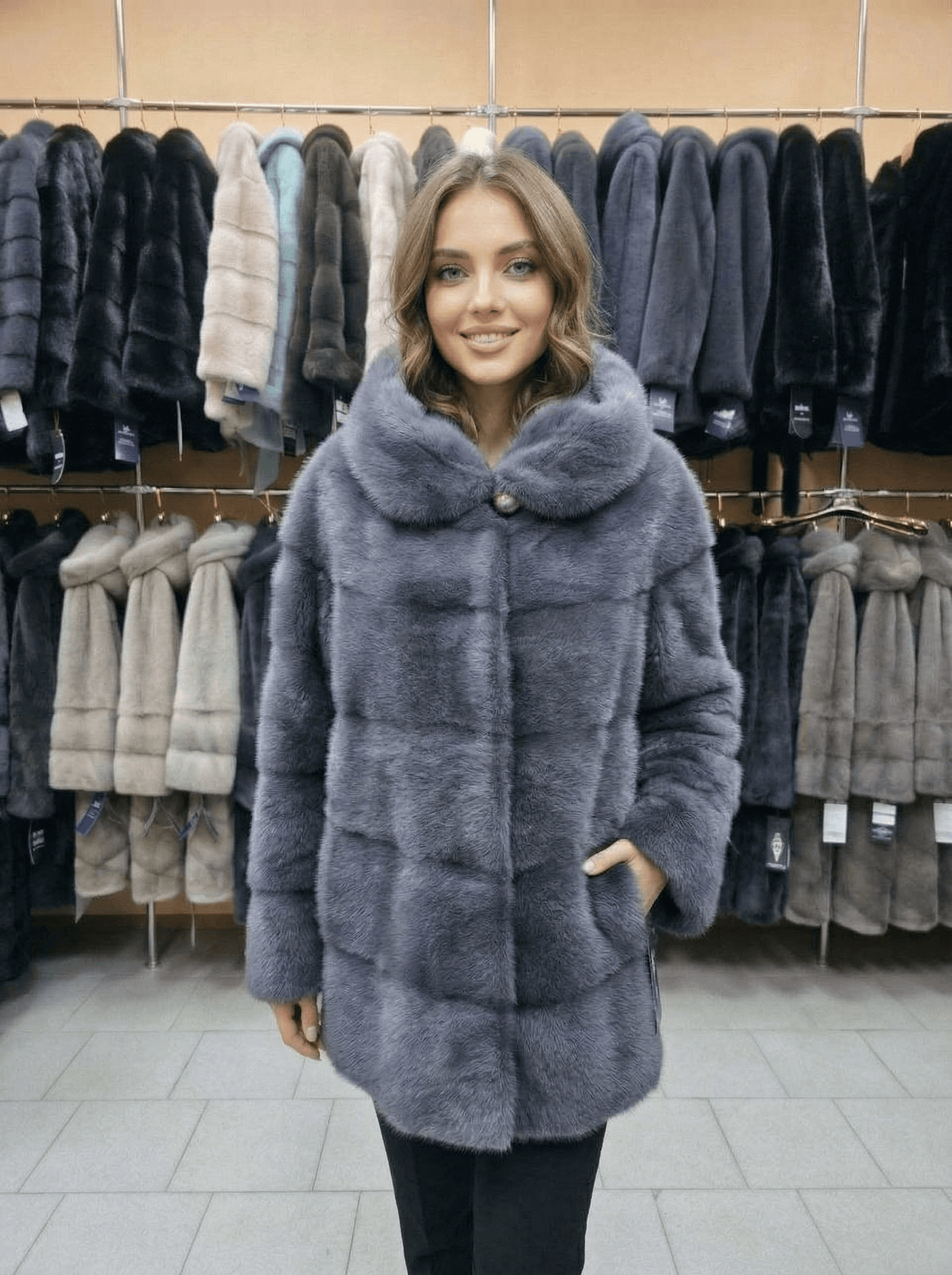 Норковый полушубок-рубашка в цвете «Графит» Ищете что-то более стильное, чем классическая шуба? Обратите внимание на этот ультрамодный полушубок в фасоне «рубашка». Это идеальный выбор для тех, кто ценит актуальные тренды, легкость и безупречный комфорт. Почему эта модель — хит сезона? Стильный фасон «рубашка»: Прямой крой с характерным закругленным низом и разрезами по бокам придает образу динамичности. Она одинаково круто смотрится и с грубыми ботинками, и с элегантными сапогами. Благородный «Графит»: Глубокий серо-стальной оттенок — один из самых практичных и статусных в меховой моде. Он роскошно переливается при дневном свете. Уютный капюшон: Объемный и теплый, он мягко ложится на плечи как воротник, а в непогоду надежно согреет и защитит вашу укладку. Комфортная длина 80 см: Идеально для активного городского ритма и максимально удобно для автоледи. Детали для вашего удобства: Мех: Натуральная норка премиального качества с густой набивкой. Размерный ряд: У нас представлена богатейшая палитра размеров — от 40 до 58. Подберем ваш идеальный вариант! Доставка по всей РФ: Бережно и быстро отправим в любой регион. Примерка перед покупкой: Оплата происходит только после примерки. Вы убедитесь в качестве меха и идеальной посадке, прежде чем принять окончательное решение.